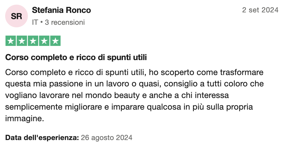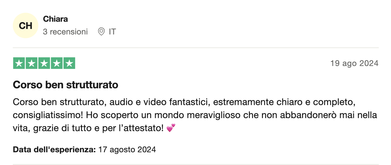 Il corso si svolge online e garantisce Diploma di Armocromista certificato per la sua qualità da IPHM Training Provider e Accademia Armocromia, valutato 5 stelle sia Da TrustPilot che da Emagister dove ha ottenuto la certificazione “Cum Laude”.